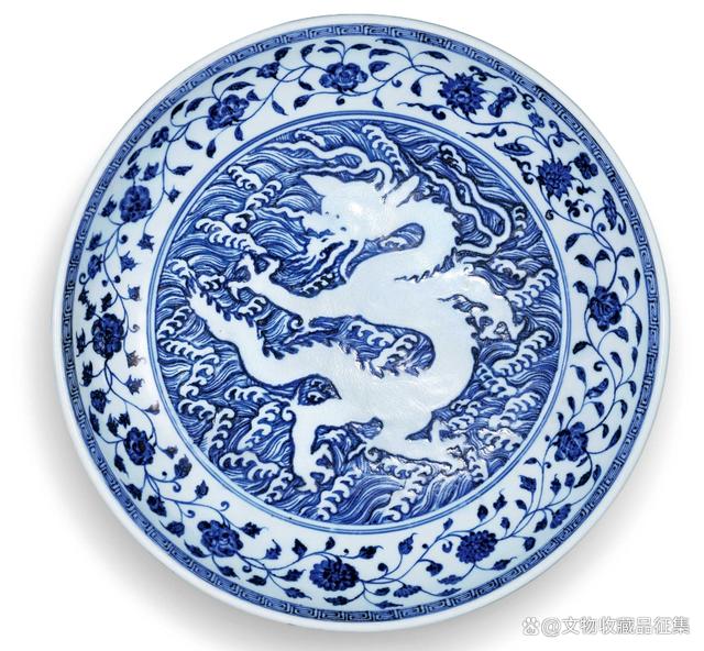 本件欧洲秘藏近百年的永乐御窑神品——“明永乐青花留白暗刻龙纹海浪大盘”,为丹麦著名建筑家所罗门·塞伦森(1856-1937)旧藏。本件大盘形制规整,大口微敛,弧腹广底,浅圈足,为明初大体量盘式的经典造型。通体青花描绘纹饰,内壁绘牵连缠绕的缠枝花卉十二朵;外壁绘奔龙四条,其间以壬字云纹间隔。盘心青花双圈内绘奔涌的海涛为地,再以留白技法浅刻须爪鳞片表现一半侧面立龙,仅双目龙睛以青花点绘,身旁围绕的火焰亦以留白技法表现,在青花海水地子的波涛衬托下,使得龙跃于渊,极具神韵。